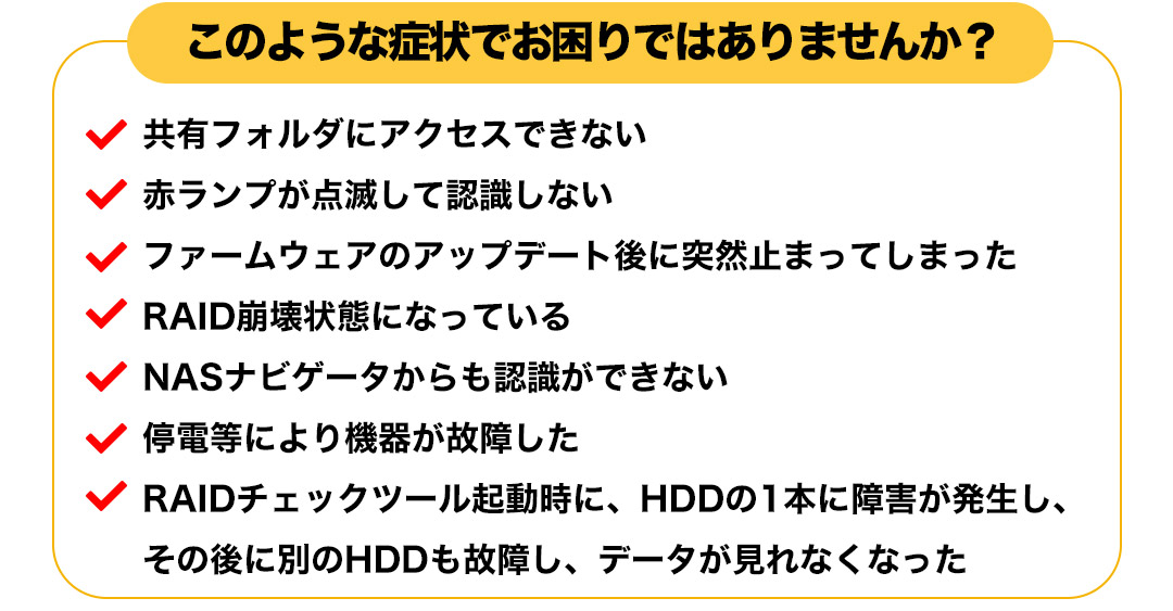 もし使用している際に、少しでも異変を感じましたら機器の利用を止め、専門業者に診断してもらうことをお勧めいたします。異変を感じているのに使用を続けてしまいますと、場合によってはデータ復旧できなくなる可能性があります。