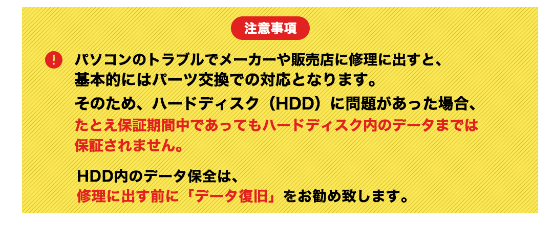 メーカから修理対応になるが、データは消えてしまうと言われてしまい、実はこのノートパソコンを所有されていたのが代表者様で、経営や財務に関するエクセルファイルが入っているとのことでした。