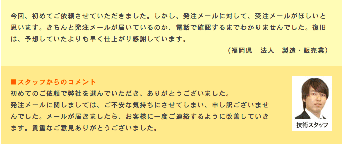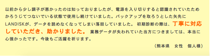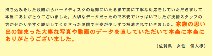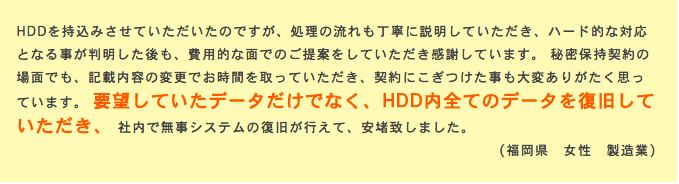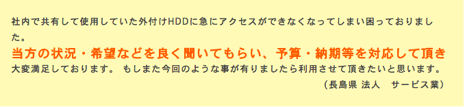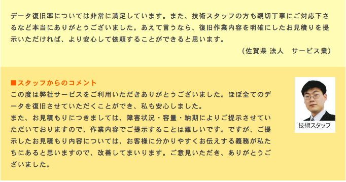 持ち込んでからもデータ復旧の担当者さんの状況説明も分かりやすく、何よりすごくスピーディに対応して頂けたため、