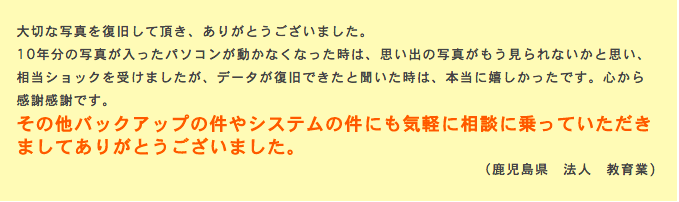 またデータ復旧の担当者さんにデータバックアップについてもアドバイスを頂きましたので、今後は二度とこのようなことにならないように気を付けてバックアップをとっていきます。